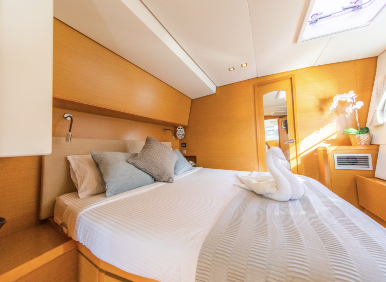 Light wood complements cool, elegant colours and large windows allow natural light and panoramic views from the salon, internal lounge and dining area. On the upper level, there is an expansive flybridge area with bimini and sun pads – a great area to enjoy the view and soak up the sun. The yacht accommodates up to 8 guests in four large, luxury cabins consisting of 1 master suite, 2 double cabins, and 1 Pullman cabin, all with private en-suite facilities.